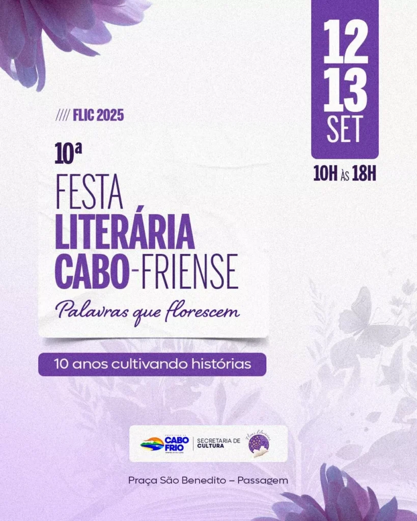Nos dias 12 e 13 de setembro, a cidade de Cabo Frio será novamente tomada pela força da literatura. A 10ª Festa Literária Cabo-friense, a FLIC 2025, chega à Praça São Benedito com o tema “Palavras que florescem – 10 anos cultivando histórias”, em uma edição especial que vai celebrar o marco de uma década […]
