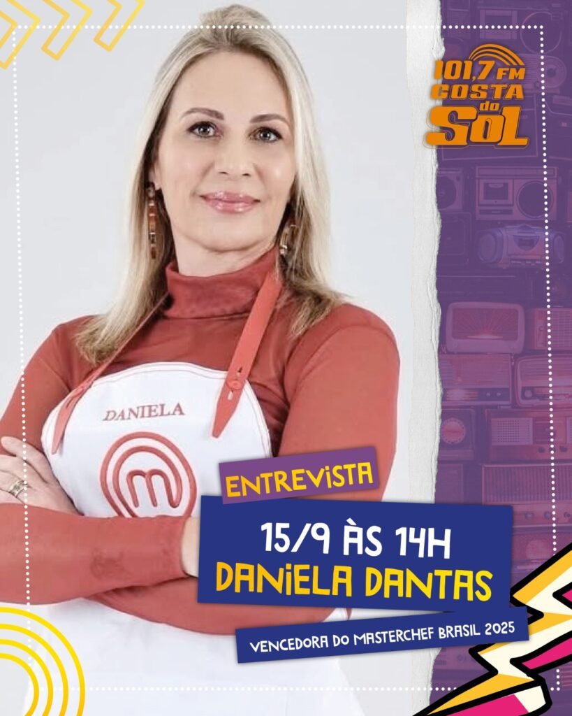 ✨🍴 Imperdível! 🍴✨A campeã do MasterChef Brasil 2025, Daniela Dantas, vai estar AO VIVO na Rádio Costa do Sol FM!📅 Dia 15/09⏰ Às 14h Fique ligado e venha se inspirar com a história e o talento da grande vencedora! 🎤🔥