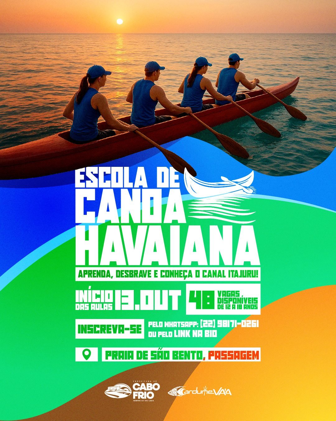 A Secretaria de Assistência Social, por meio da Secretaria-Adjunta da Família e Juventude, em parceria com a Escola de Canoa Havaiana Cardume Va’a, vai disponibilizar 48 vagas gratuitas para aulas de canoa havaiana para crianças e adolescentes. As aulas vão ter início em 13 de outubro, na Praia de São Bento, no Canal do Itajuru.