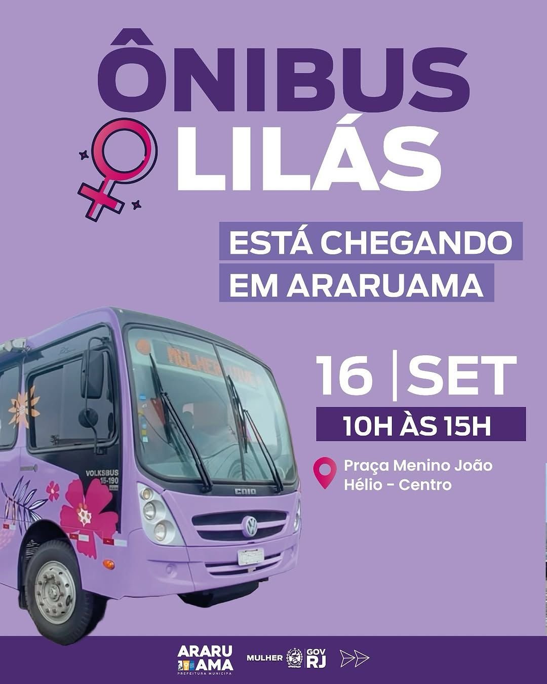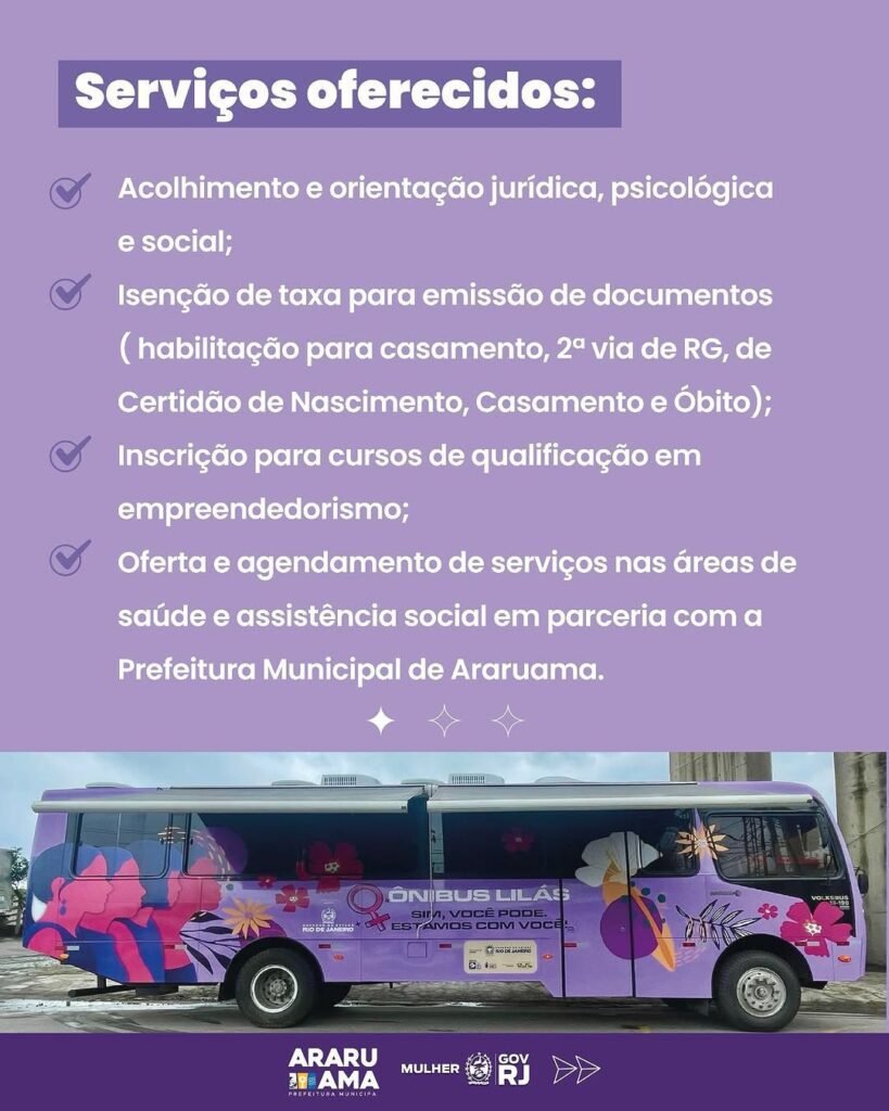No dia 16 de setembro, Araruama vai receber o Ônibus Lilás, um importante projeto voltado para o acolhimento e atendimento gratuito às mulheres.